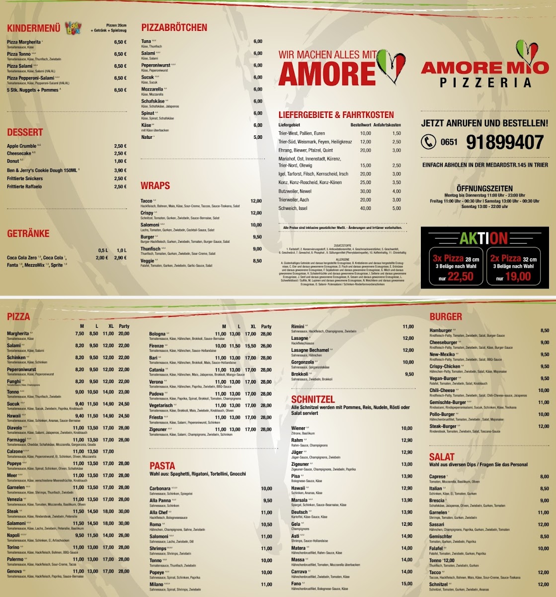 Introducing the menu of Pizzeria Lieferservice Amore Mio, where authentic Italian flavors meet exceptional service in Trier. Located at Medardstraße 145, this delightful pizzeria has earned rave reviews for its timely deliveries and mouthwatering dishes. Customers praise the friendly drivers and the warmth of their meals upon arrival, creating an inviting dining experience, even from home.